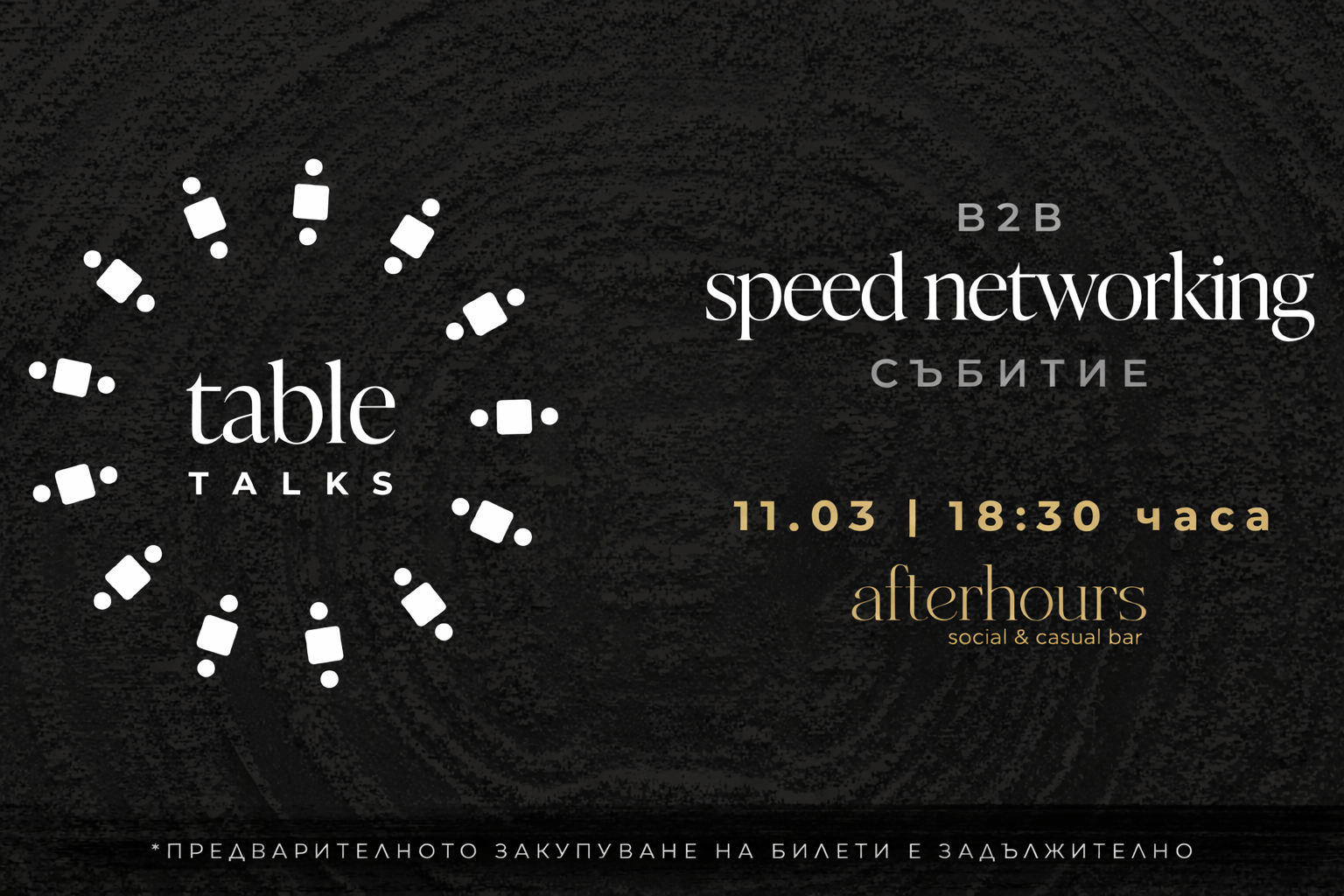 Table Talks е B2B Speed Networking събитие, създадено за хора, които нямат време да губят. Форматът събира предприемачи, собственици на компании и бизнес лидери в динамична среда и разглежда 3 основни въпроса: